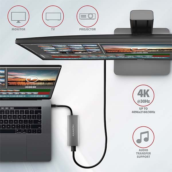 HDMI výstup poskytuje kvalitný obraz až do rozlíšenia 4K/60Hz Ultra HD a podporuje prenos viackanálového zvuku. Podporované sú aj vysoké frekvencie v obľúbených hráčskych rozlíšeniach 2K/120Hz alebo FullHD/120Hz. Vďaka podpore HDR (vysoký dynamický rozsah) si môžete bez obmedzenia vychutnať výrazne rozšírený rozsah farieb a kontrastov. Pre správne fungovanie video výstupu je nutné, aby notebook mal USB-C port s podporou DisplayPort Alternate Mode (DP Alt Mode) alebo port Thunderbolt 3, 4 a vyššie.