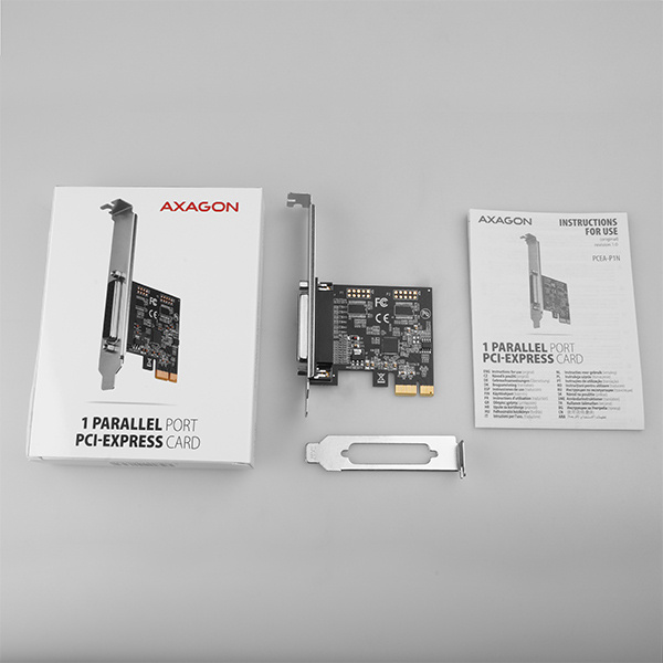 PCI-Express karta AXAGON PCEA-P1N rozšíří stolní počítač o jeden paralelní port s DB25 konektorem. Dovoluje tak připojit k počítači paralelní zařízení jako jsou tiskárny, plotry, hardwarové klíče, EPROM programátory a podobně. Bezproblémová kompatibilita a široké možnosti nastavování portů jsou zajištěny použitím osvědčeného čipsetu společnosti ASIX. Díky přibalené low profile záslepce lze řadič osadit jak do standardní, tak i do nízkoprofilové PC skříně.