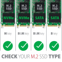 Adaptér podporuje použití B-key SATA i M-key NVMe (PCI-Express) M.2 SSD disků, jednostranných i oboustranných. Redukce nemá omezení kapacity SSD disků a lze použít M.2 karty všech rozměrů až do délky 110 mm. Samozřejmostí je fungování obou disků zároveň.