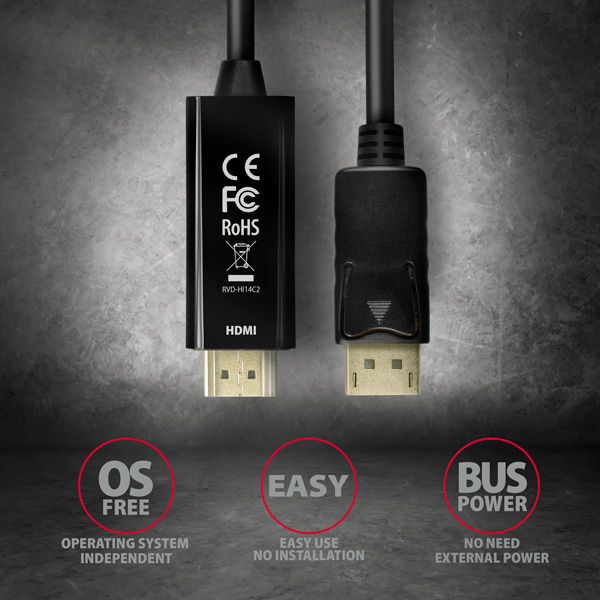 DisplayPort -> HDMI aktivní kabel - redukce AXAGON RVD-HI14C2 pro připojení HDMI monitoru/TV/projektoru k počítači s výstupem DisplayPort. Šikovný malý hardwarový převodník bez potřeby jakékoliv instalace či nastavování zajistí kvalitní přenos obrazu i zvuku až do rozlišení 4K/30Hz. Přenos obrazu a zvuku z počítače nebo notebooku bude nyní hračkou. Kompaktní rozměry zajistí snadné použití i v místech s nedostatkem prostoru. Jedná se o ideální řešení - nepotřebujete HDMI kabel a redukci. S tímto aktivním kabelem je vše integrováno do jednoho celku. Kabel je pouze jednosměrný, tj. převodník z DisplayPort na HDMI, ne naopak.