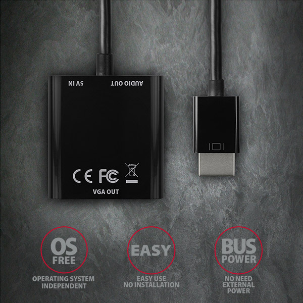 Popis AXAGON RVH-VGAN, HDMI -> VGA redukcia/adapter, FullHD, audio výstup, micro USB napr. konektor