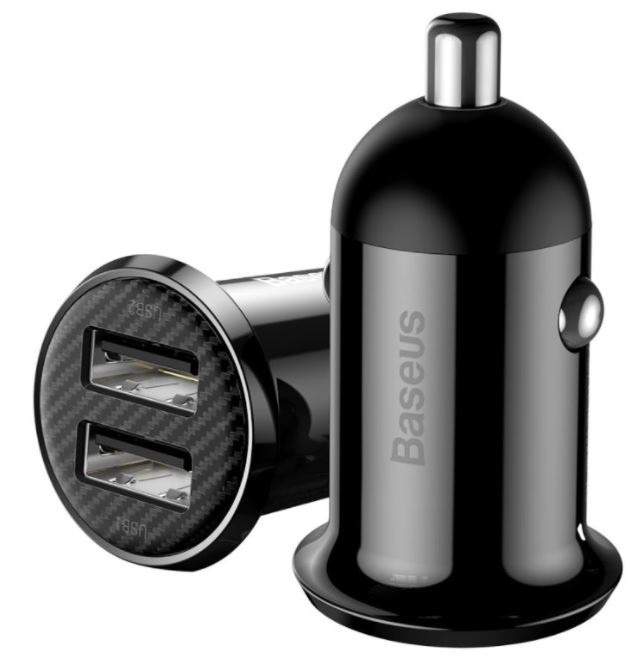 Baseus Grain Pro Dual USB kompaktní nabíječka s nabíjecím proudem až 4.8A Opravdu minimalistické provedení, dva USB výstupy a minimalistický design jako perfektní doplněk interiéru vašeho vozu. Nabíječka podporuje nabíjecí proud a napětí 5V a 2.4A