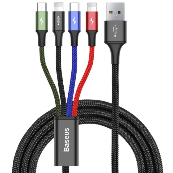 Baseus 4v1 nabíjecí kabel určený pro zařízení s USB-C, Lightning a MicroUSB zařízení. Navíc zde najdete dvě koncovky Lightning pro maximální využití všech vašich zařízení na maximum. Nabíjejte až 4 zařízení najednou.
