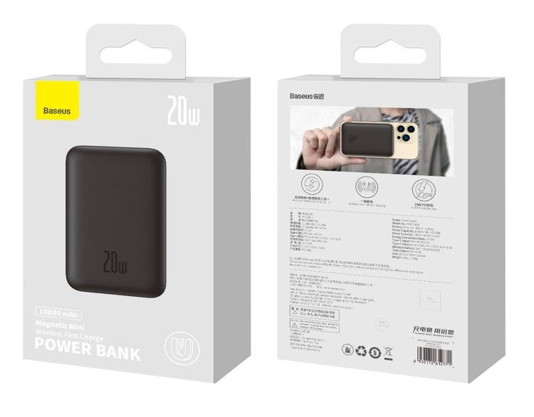 Baseus Magnetic Mini | Power Bank 10000mAh 20W s bezdrátovým nabíjením MagSafe Overseas Edition Kompaktní power banka s kapacitou 10000 mAh a výkonem 20 W. Je vybaven vstupním/výstupním portem USB-C. Inteligentní obvody automaticky volí parametry proudu podle nabíjeného zařízení.