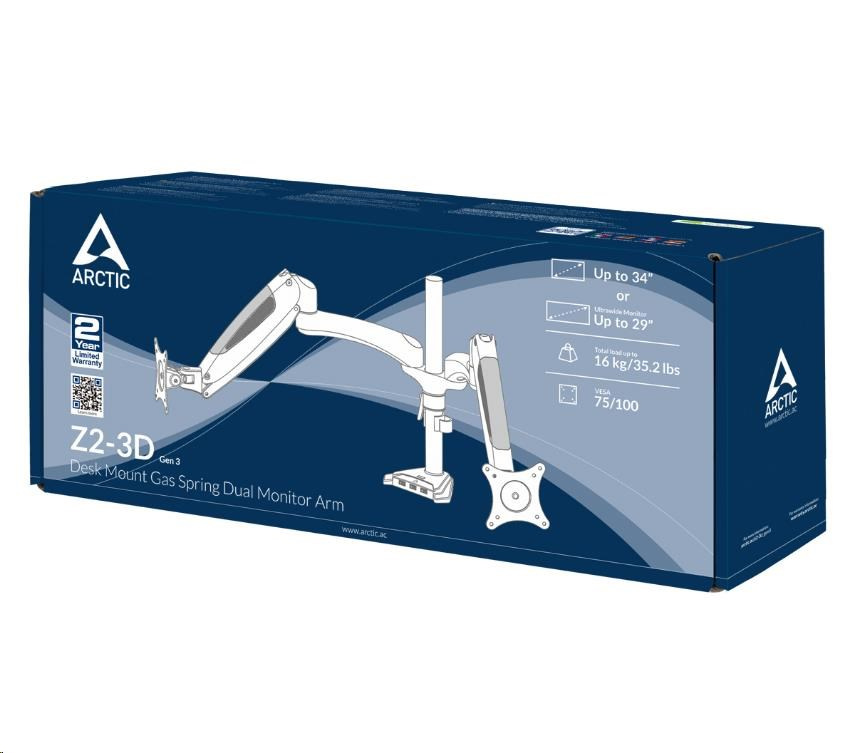 The ARCTIC Z2-3D (Gen 3) monitor arm supports the latest ultrawide monitors (up to 29 inches) with ease. Classic 16:9 monitors are also compatible (up to 34 inches). The Z2-3D (Gen 3) supports monitors with 8 kg/17.6 lbs per arm.