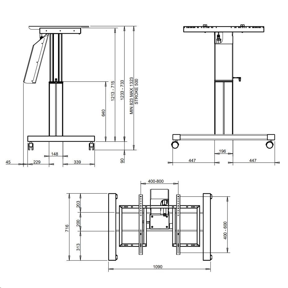 Stojan na televízory a monitory, ktorý má plne motorické nastavovanie výšky aj náklonu obrazovky, ovládanie pomocou ovládacieho panelu. Kedykoľvek môžete zmeniť výšku obrazovky v rozmedzí od 788mm až do 1288mm (výška od podlahy po stred obrazovky) a náklon obrazovky od 0° (obrazovka je zvisle) až do 90° (obrazovka je vodorovne) jednoducho a rýchlo stlačením tlačidla na diaľkovom ovládači. Konštrukcia televízneho stojana je profesionálnej kvality, zaviesť je možné televízory a monitory s hmotnosťou až 150kg.