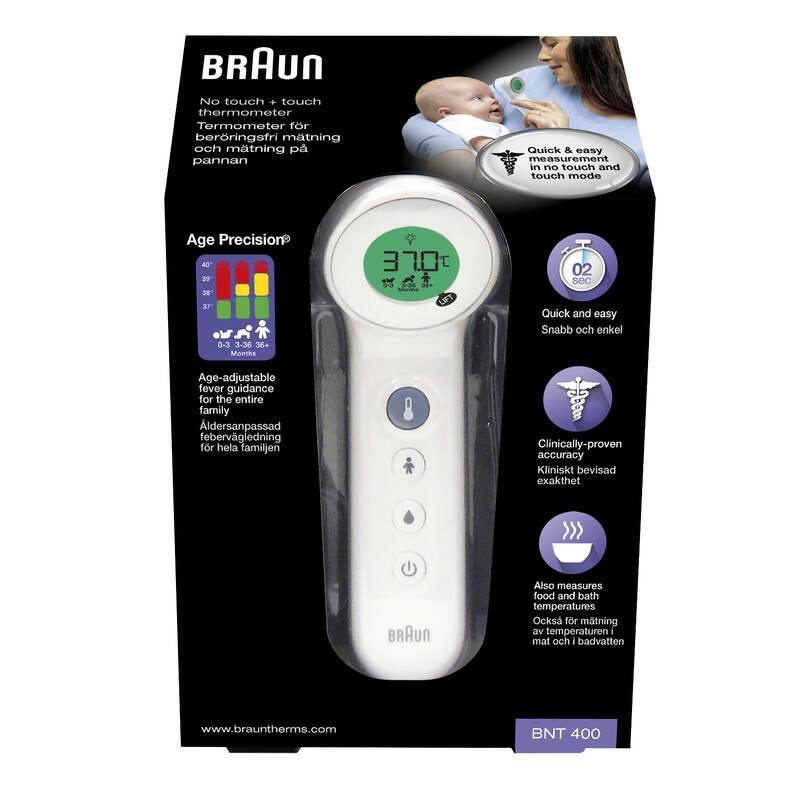 Bezdotykový + dotykový teplomer s presnosťou Age Precision. Patentovaný teplomer využíva technológiu pre jednoduché, bezdotykové a neuveriteľne presné meranie teploty. Chcete-li vykonať meranie v dotykovom režime, umiestnite teplomer medzi obočie na čelo. V bezdotykovom režime držte teplomer medzi obočím približne 2 cm pred čelom dieťaťa. Meranie je teda bez stresu a možno ho vykonať bez rizika, že dieťa vzbudíte. Okrem toho je možné použiť tichý režim, takže môžete merať teplotu dieťaťa takmer nepočuteľne. Okrem toho môžete pomocou režimu Jedlo a tekutiny ľahko merať teplotu jedla, nápojov alebo vody vo vani vášho dieťaťa. Poznámka: Používateľ by mal medzi opakovanými meraniami u tej istej osoby počítať s primeraným časovým odstupom. Na čistenie vždy utrite navlhčenou handričkou a potom utierkou osušte. Nikdy nepoužívajte antibakteriálne čistiace prostriedky a utierky, pretože môžu prístroj nenávratne poškodiť.