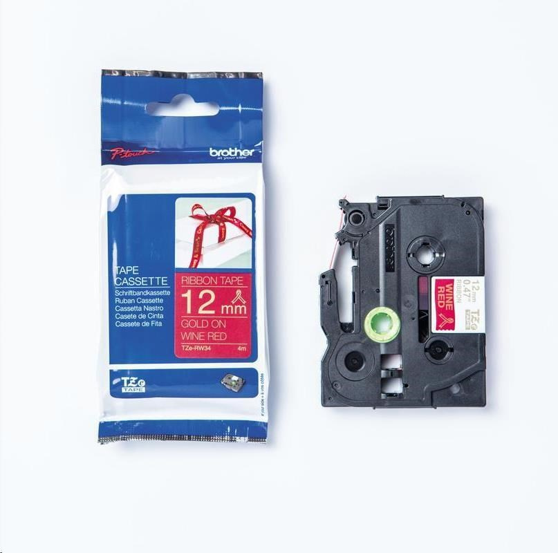 Popis BROTHER TZE-RW34 - 12 mm široká kazeta s TZ páskou, 4 m TEXTILNÁ páska - na výrobu darčekov - NEŠPECKOVATÁ - ČERVENÁ PÁSKA, ZLATÝ POTISK