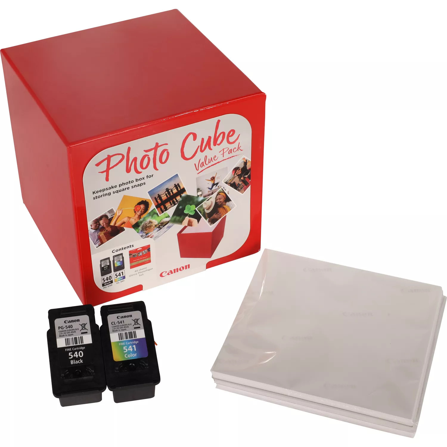 *Foto kostka červený úložný box *1 x PG-540 Černá inkoustová kazeta 8 ml *1 x CL-541 C/M/Y barevná inkoustová kazeta 8 ml *PP-201 5 x 5” fotografický papír Plus lesklý II (40 listů)