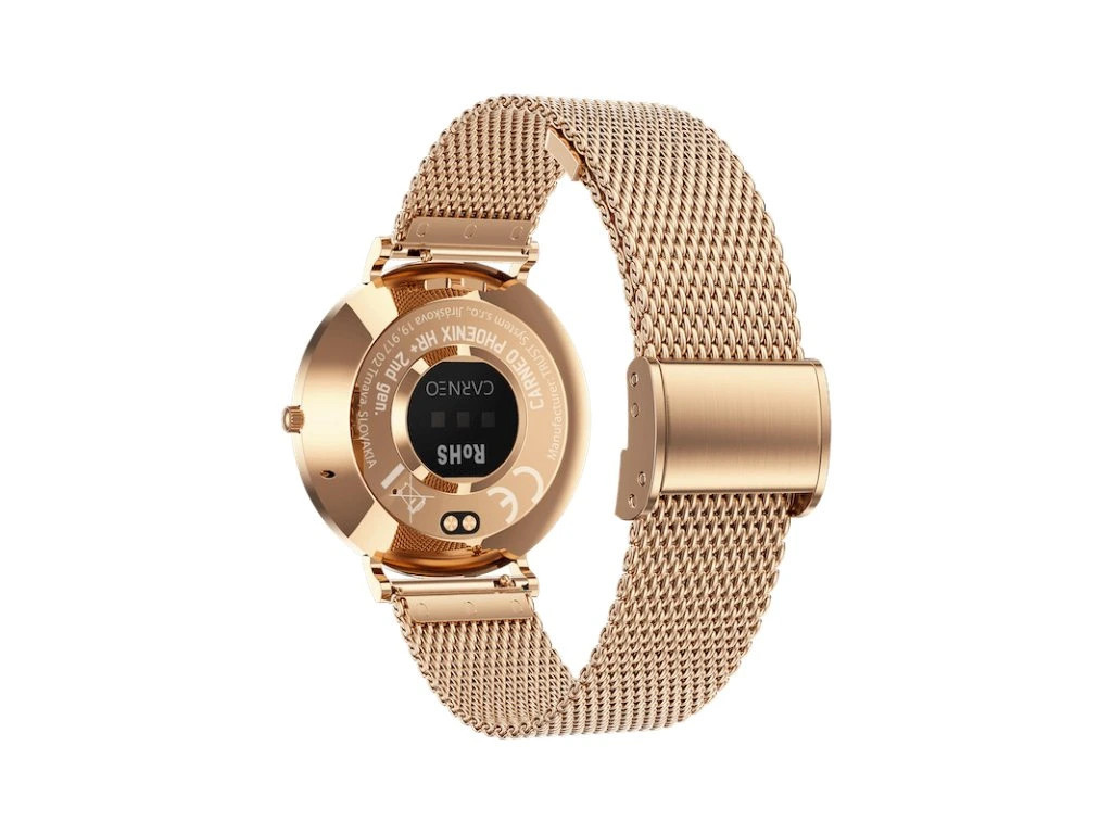 Druhá generace luxusních fitness hodinek CARNEO Phoenix HR+ z nerezové oceli se zlatou povrchovou úpravou a kovovým milánským řemínkem s barevným dotykovým displejem AMOLED HD monitorují vaši denní aktivitu, úroveň stresu, ale lze je také spárovat s mobilním telefonem a upozornit vás na příchozí hovor nebo SMS. Hodinky umožňují telefonovat, aniž byste museli telefon vyndat z tašky, díky vestavěnému mikrofonu a reproduktoru až do vzdálenosti 10 m od telefonu. Jejich extrémně tenké tělo z nerezové oceli s jednoduchými křivkami je tak návykové, že je po prvním nošení nebudete chtít sundat z ruky. Výška bočního okraje pouhé 4 mm a hmotnost pouhých 35 g zaručují dokonalou diskrétnost na ruce. Model Phoenix je vzhledem ke své velikosti a hmotnosti určen pro ty, kteří nejsou nadšenci do chytrých hodinek.