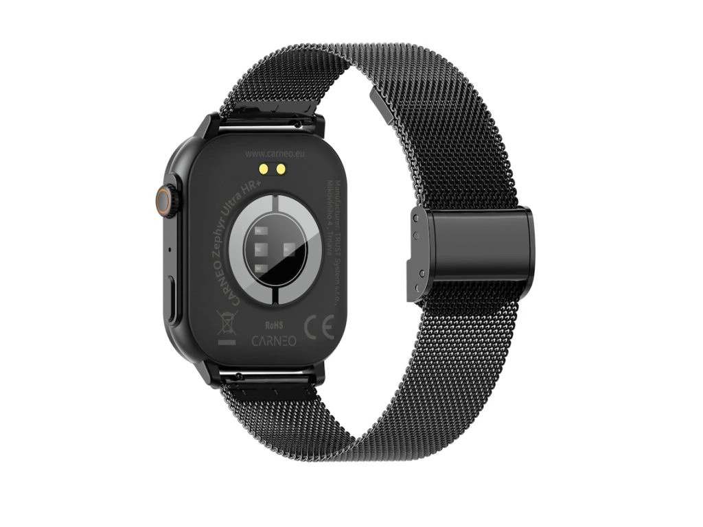 Moderní, designově propracované fitness hodinky CARNEO Zephyr Ultra HR+ v černé barvě s černým, kovovým, pleteným řemínkem a barevným SUPER AMOLED displejem s vysokým jasem a funkcí trvalého zobrazení času. Monitorují vaši denní aktivitu, úroveň stresu a lze je spárovat s mobilním telefonem díky čemuž Vás upozorní na příchozí hovor nebo SMS. Hodinky umožňují telefonovat, aniž byste museli telefon vyndat z tašky, díky vestavěnému mikrofonu a reproduktoru až do vzdálenosti 10 m od telefonu. Jejich bezchybné kovové tělo s nadčasovými outdoorovými křivkami je tak návykové, že je po prvním nošení nebudete chtít sundat ze zápěstí. Tvrzené minerální sklo ochrání jejich křišťálově čistou obrazovku před poškrábáním.