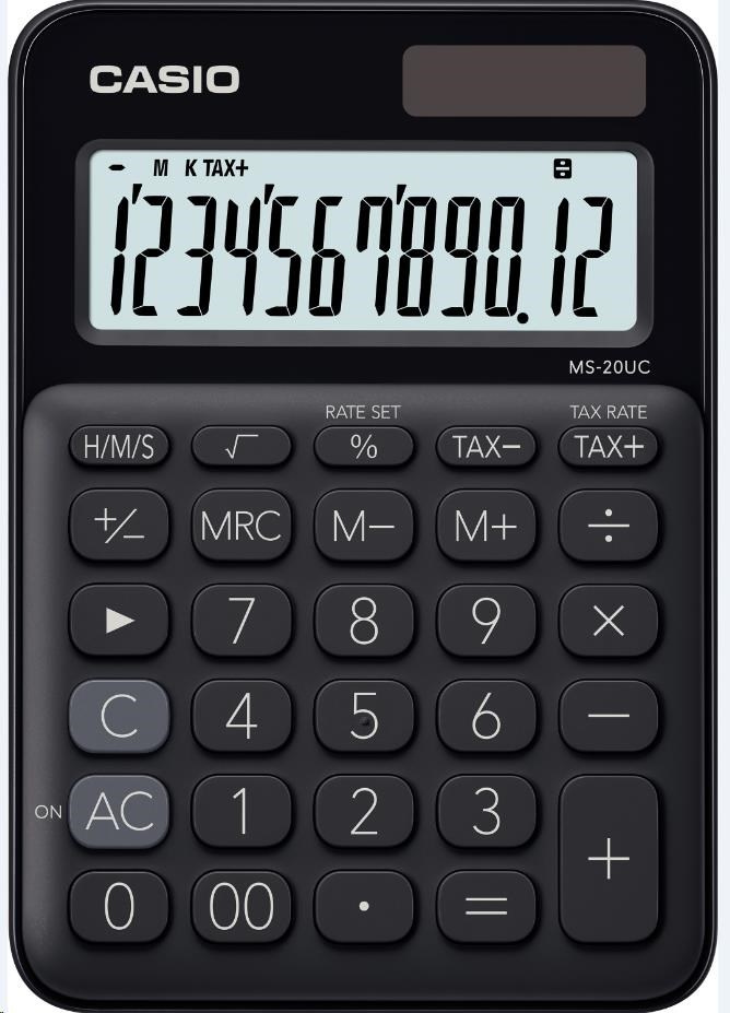 Stolový kalkulačka v módnych trendových farbách Veľký 12-miestny displej Výpočet DPH Výpočet percentuálneho podielu Výpočet odmocniny Tlačidlo +/- Tlačidlo na opravu zadania Tlačidlo dvojitá nula Výpočty s časom Napájanie: duálne solárne / batériové Rozmery: 23x105x149,5 mm Hmotnosť: 110g čierna farba EAN 4549526700088