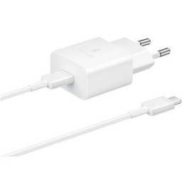 Samsung cestovní nabíječka do sítě s USB-C výstupem a maximálním výkonem 15W a USB-C nabíjecím kabelem.