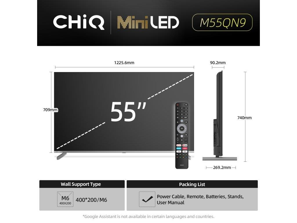 CHiQ M55QN9V, 55" (139 cm), kovová bezrámová Smart MiniLED Google TV 5.0, Ultra HD (4K), DLG 120 Hz, MEMC, lokálne stmievanie, Dolby Atmos, Dolby Audio, dbx-tv, HDR 10, HLG, Dolby Vision, WiFi 2,4/5G, Bluetooth 5.0, webový prehliadač, Google Assistant, Chromecast, O2 TV, YouTube, Netflix, Prime Video, pamäť 2GB+16GB, 4x HDMI, 2x USB, CI slot, 20 W, energetická trieda F.