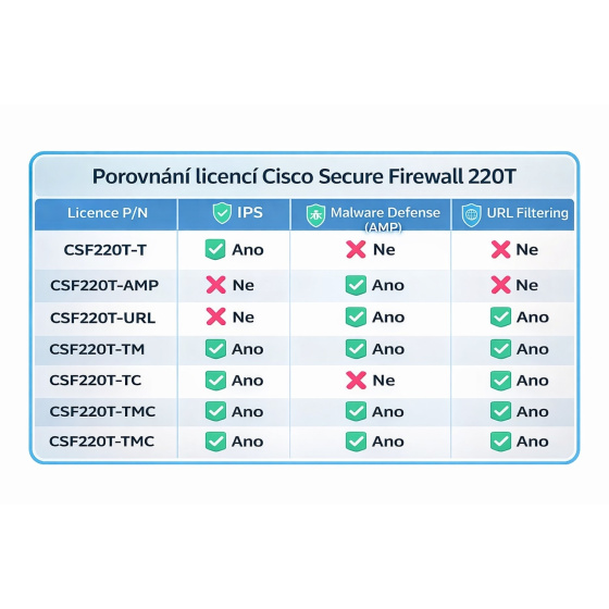 Funkce licence *IPS (Intrusion Prevention): Ano *Malware Defense (AMP): Ano *URL Filtering: Ano *Typ licence: Threat + Malware + URL (TMC) *Software: Cisco Firepower Threat Defense (FTD)