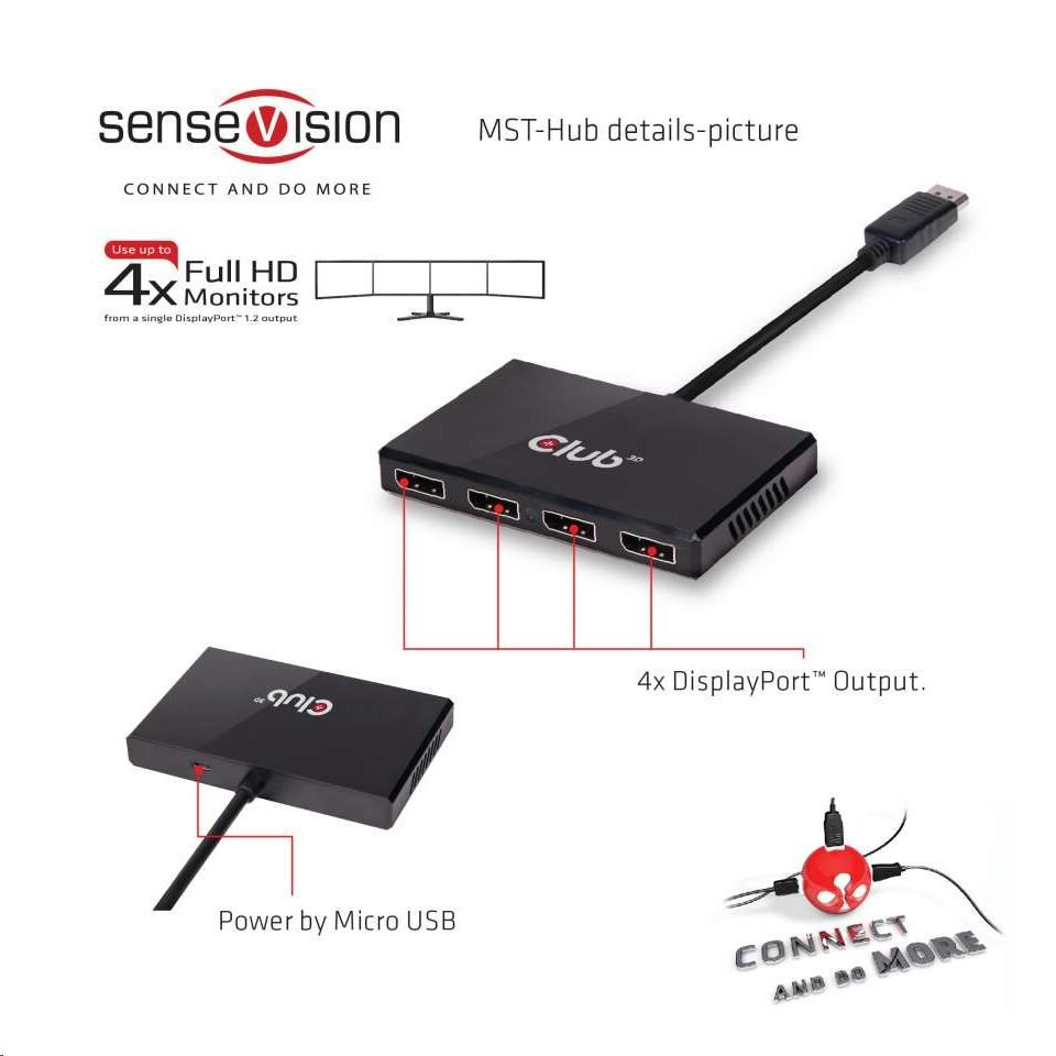 Rozbočovače Club 3D SenseVision MST využívajú technológiu Multi Stream Transport, jedinečnú funkciu DisplayPort ™ 1.2, ktorá umožňuje prenášať viac nezávislých nekomprimovaných video (a audio) tokov na jedinom kábli To umožňuje použitie viacerých monitorov pripojených pomocou rozbočovača MST. Rozbočovače Club3D MST sú schopné distribuovať tieto video toky na pripojené obrazovky.