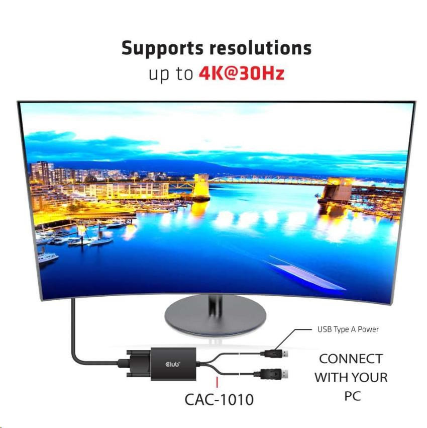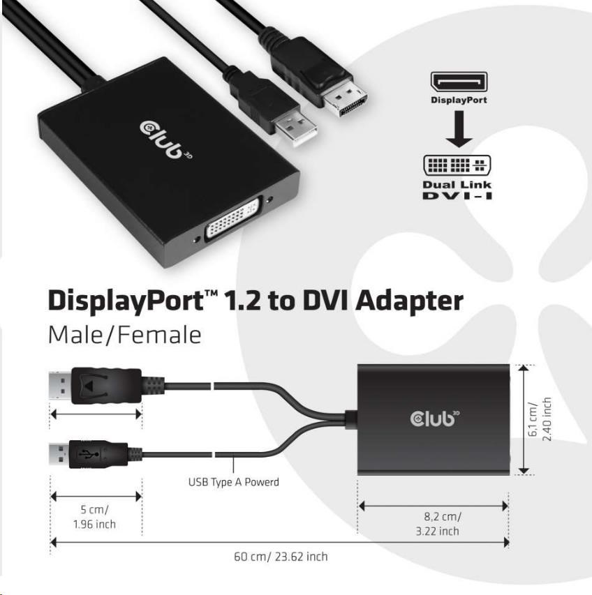 Popis Club3D Aktívny adaptér DisplayPort na Dual Link DVI-D, napájanie USB, 60 cm, HDCP ON