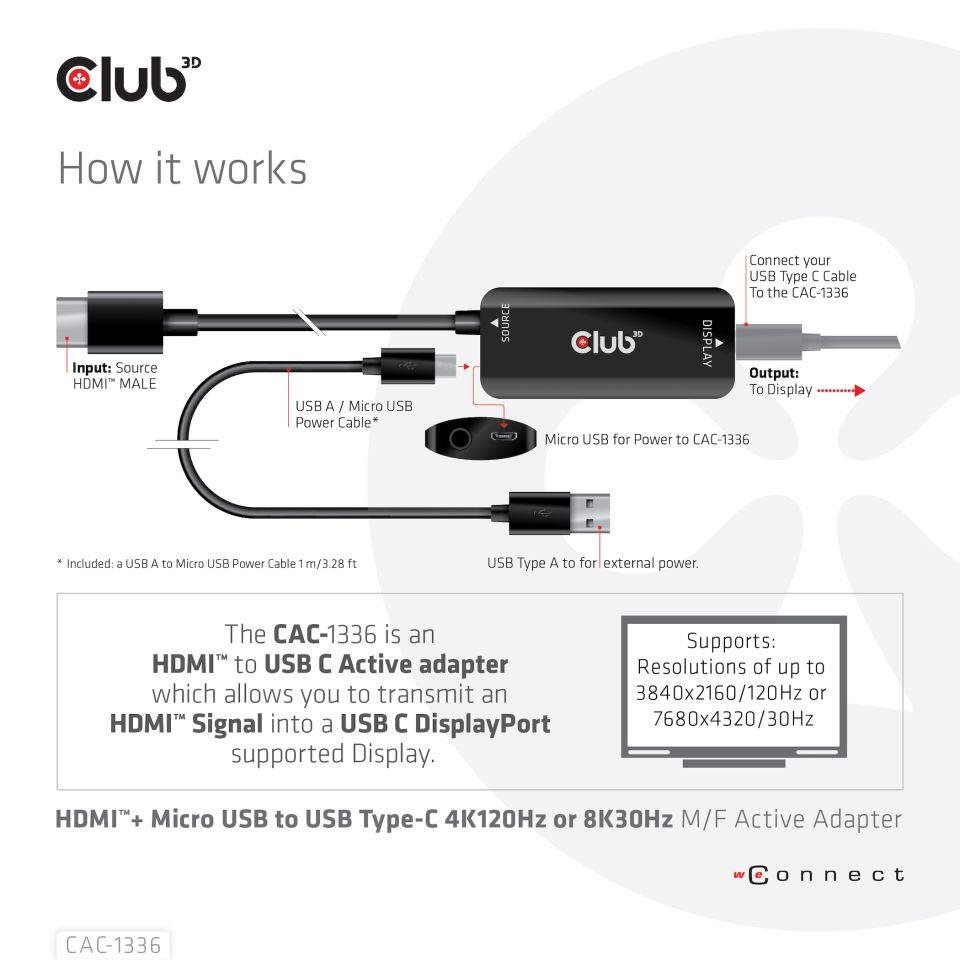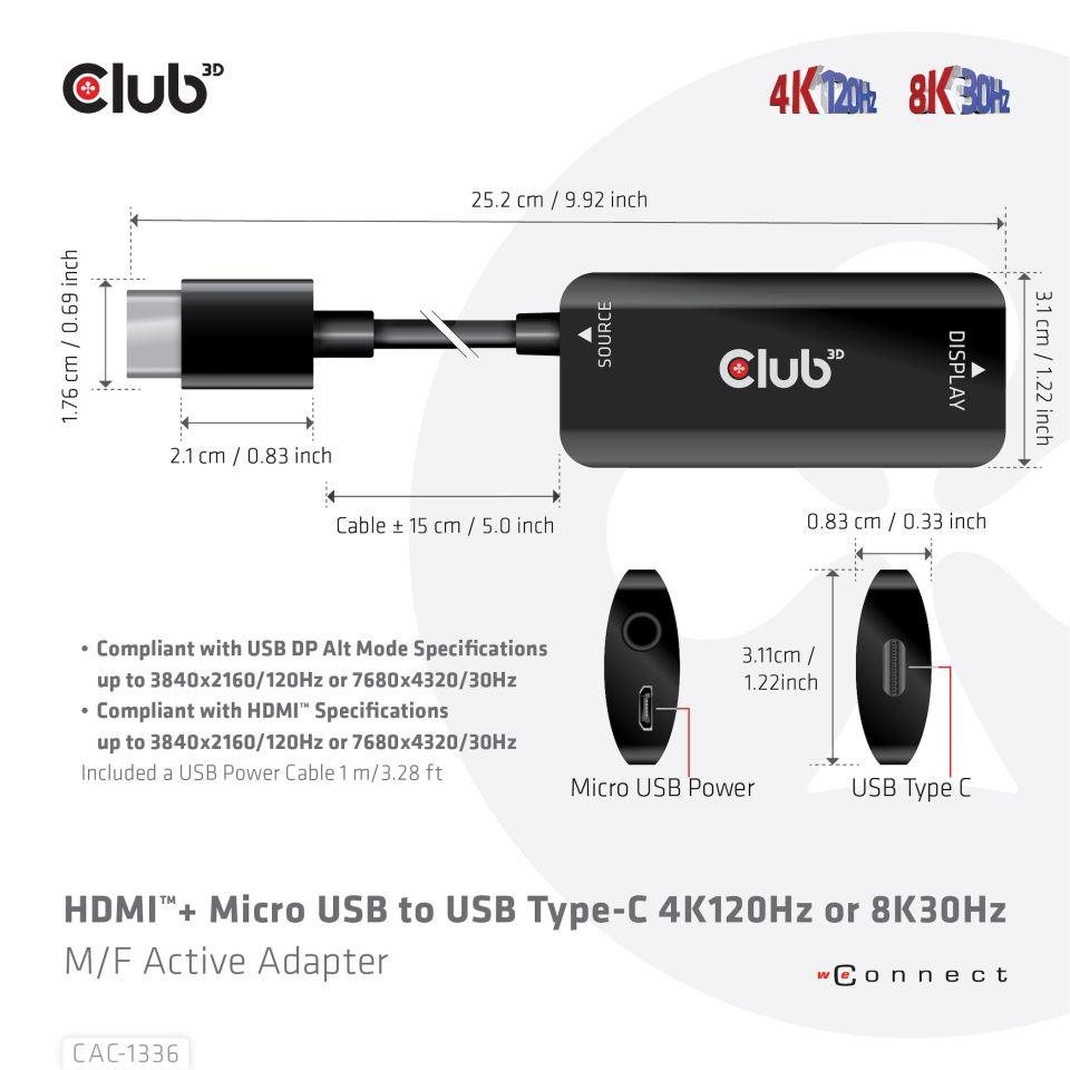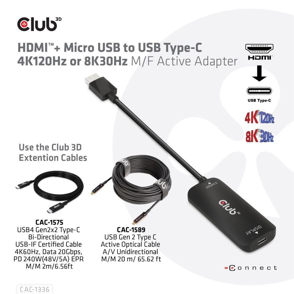 Popis Club3D Adaptér HDMI + Micro USB na USB-C 4K120Hz/8K30Hz, Active Adapter M/F