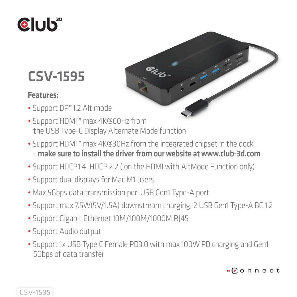 The Club 3D CSV-1595 USB Gen1 Type-C 7-in-1 hub with with 2x HDMI™, 2x USB Gen1 Type-A, 1x RJ45, 1x 3.5mm Audio, 1x USB Gen1 Type-C 100W Female port, provides a very advanced, efficient solution to extend a single USB Gen1 Type-C port to multiple ports. It integrates video, data and power ports that allows to connect 2 displays simultaneously for enjoying videos on a larger screen, connect multiple USB Gen1 devices for data transmission up to 5Gbps, connect a Gigabit Ethernet source for getting your PC connected to super high speed network, or connect to headset to enjoy fantastic music. It also provides PD charging for support up to max. 100W PD charging. This is for operating this device and charge the host simultaneously. It can work on all DP™1.4 Alt mode supported USB Gen1 Type-C hosts.