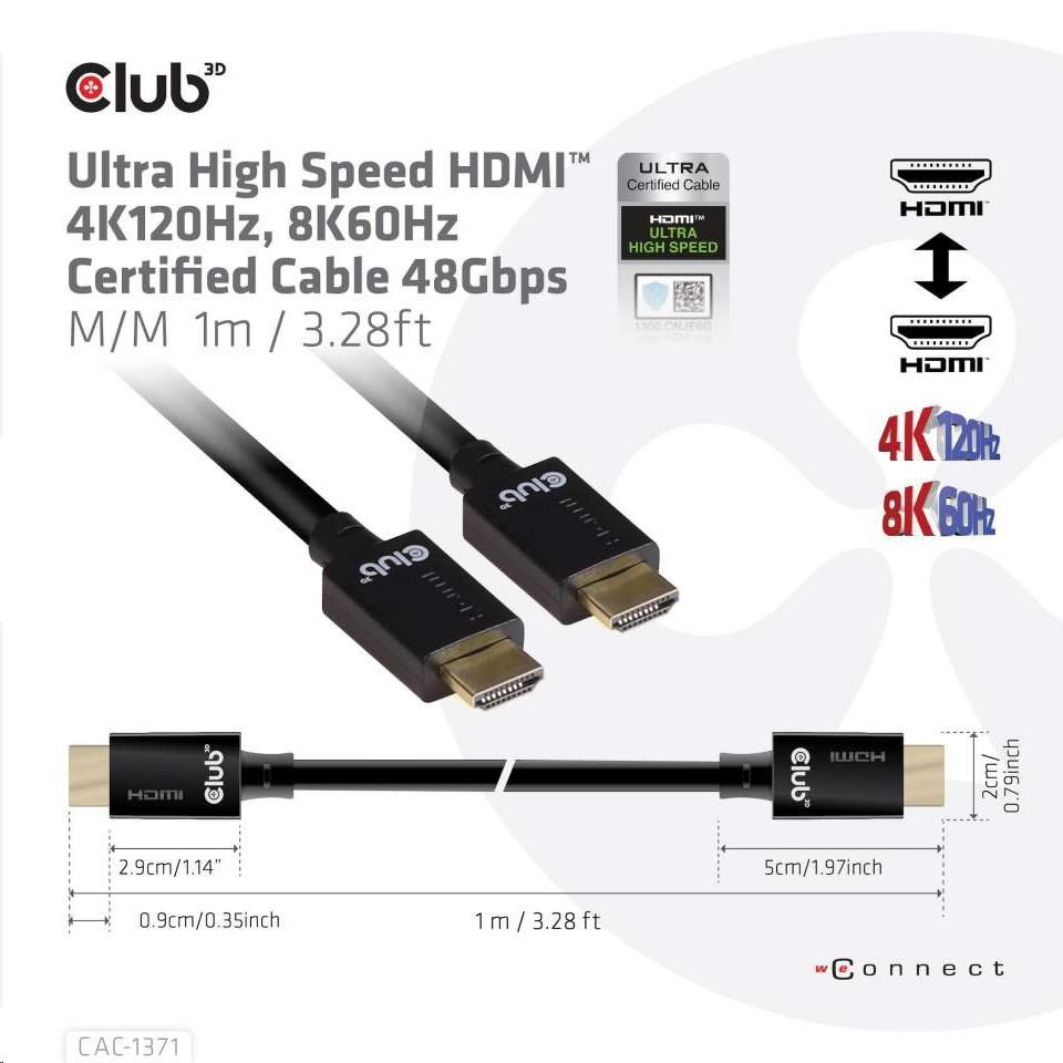 Názov produktu: Club3D HDMI kábel 2.1 Ultra High Speed 4K 8K60Hz 48Gbps (M/M), 1m