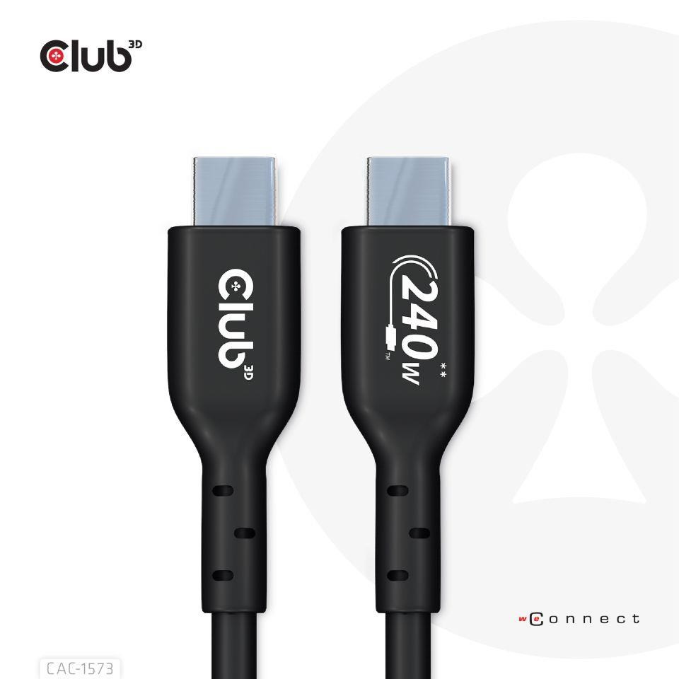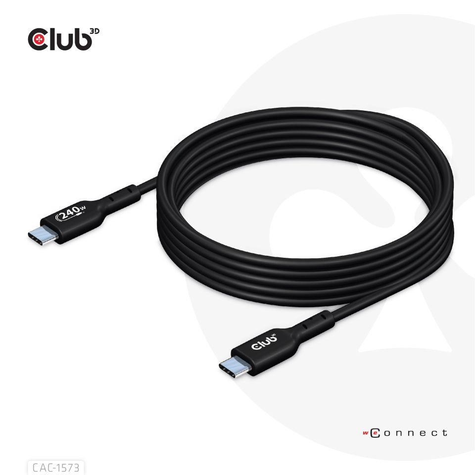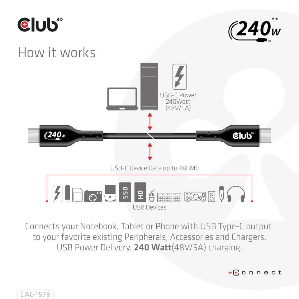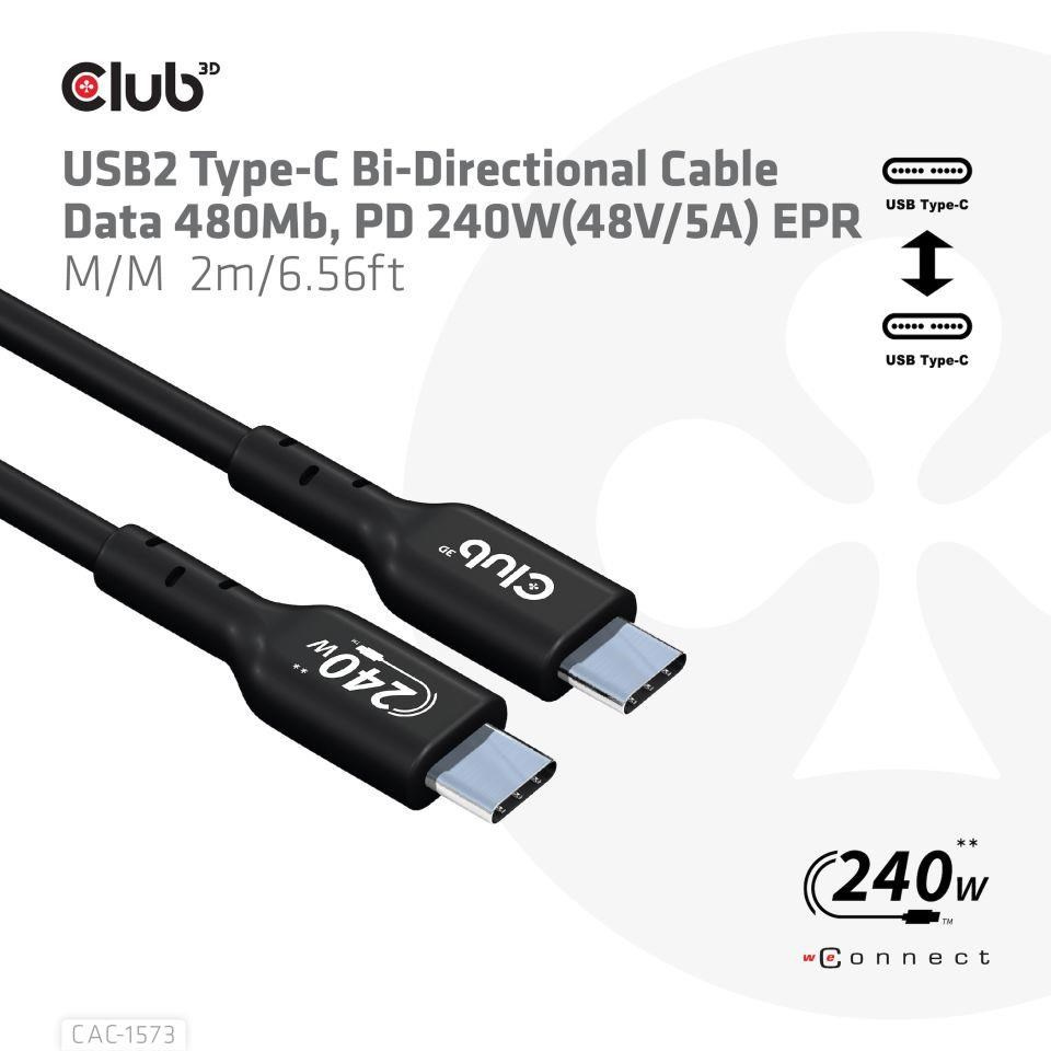 Club 3D CAC-1573 USB2.0 Obojsmerný kábel typu C, dáta 480Mb, PD 240W(48V/5A) EPR, rozšírený rozsah napájania M/M 2m/6.56ft pripojí váš notebook, tablet alebo telefón s výstupom USB typu C k vašim obľúbeným existujúcim periférnym zariadeniam, príslušenstvu a nabíjačkám. Umožňuje prenos dát a napájanie cez jeden kábel a oboma smermi. Tento kábel podporuje USB2.0 dát až do 480 Mb/s a výstupom až do 240 Wattov (48 V/5 A) na následné nabíjanie alebo napájanie notebooku, tabletu alebo smartfónu.