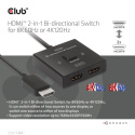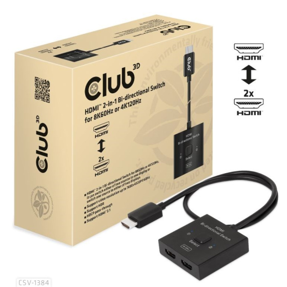 Club 3D CSV-1384 je obousmerný prepínač HDMI™ 2-v-1 pre 8K60Hz alebo 4K120Hz. Môže prepínať jeden zo dvoch zdrojov na jeden displej alebo prepínať jeden zdroj na jeden zo dvoch displejov. Stlačením tlačidla prepínača vyberte kanál 1 alebo kanál 2. S kusom pevného kábla HDMI™ (pigtail) o dĺžke 0,5 m / 1,64 stopy tento prepínač nielen znižuje náklady, ale aj šetrí čas zákazníkom. Tento typ prepínača HDMI™ smeruje video s vysokým rozlíšením (vo viacerých rozlíšeniach a až 8K60Hz) a digitálny zvuk zo zdrojov do zobrazovacích jednotiek.