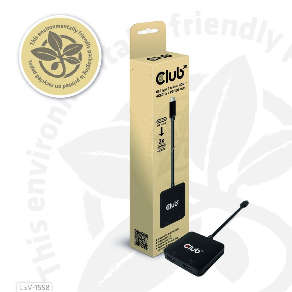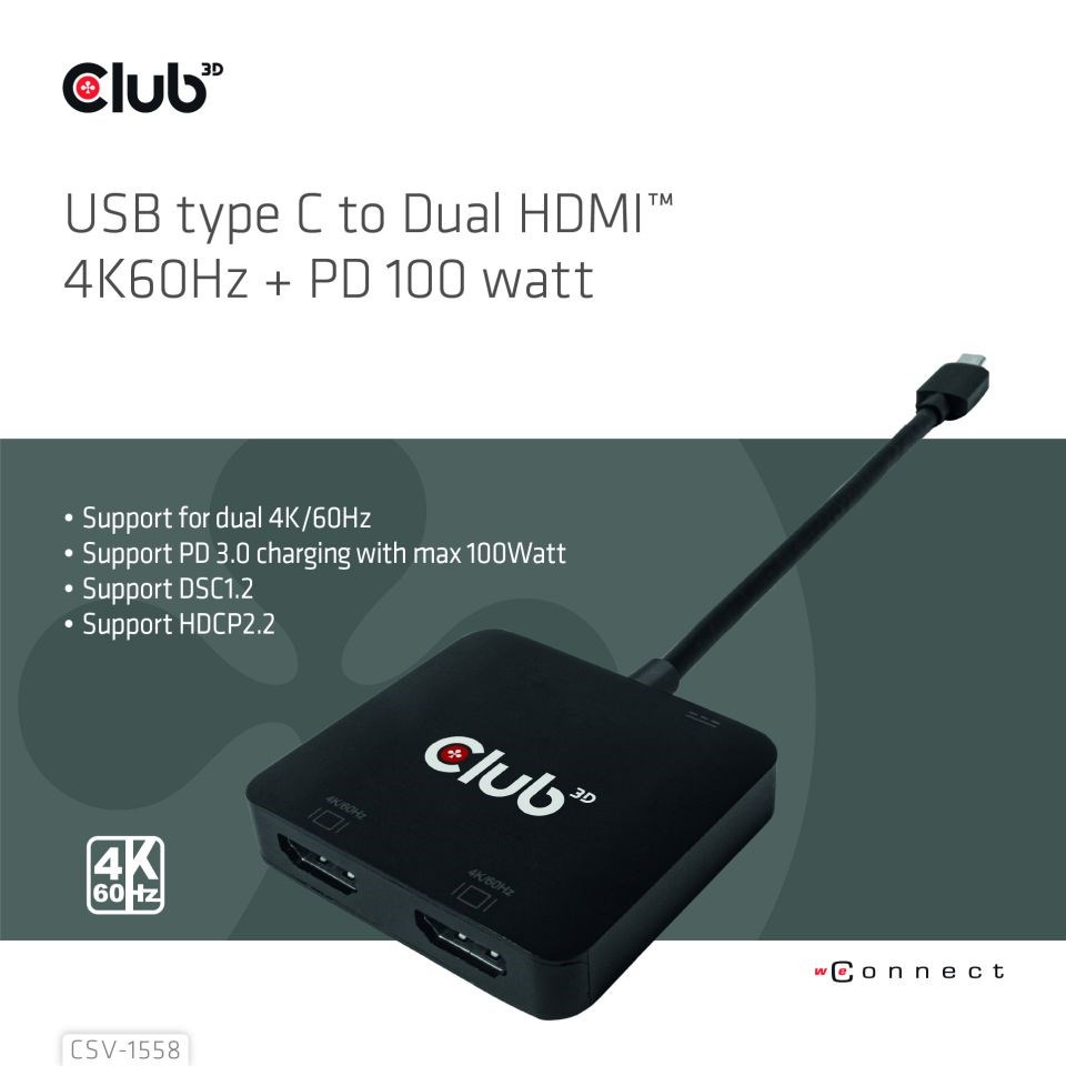 Club 3D CSV-1558 USB Type-C na Dual HDMI™ 4K60Hz + PD 100 watt Nabíjanie v režime DP1.4 Alt, umožňujúce rozšíriť port USB Type-C hostiteľa na 2x HDMI™ displeje s ultra vysokým rozlíšením max 4K60Hz pre každý displej súčasne. Vďaka podpore funkcie MST je možné zobraziť duálne displeje s rôznym obsahom videa súčasne. Okrem toho podporuje nabíjanie PD s maximálnym výkonom 100 W. Môže fungovať na všetkých zariadeniach USB Type-C alebo Thunderbolt™ s podporou režimu DP™ Alt (vrátane telefónov s pripojením USB Type-C a podporou režimu DP™ Alt).