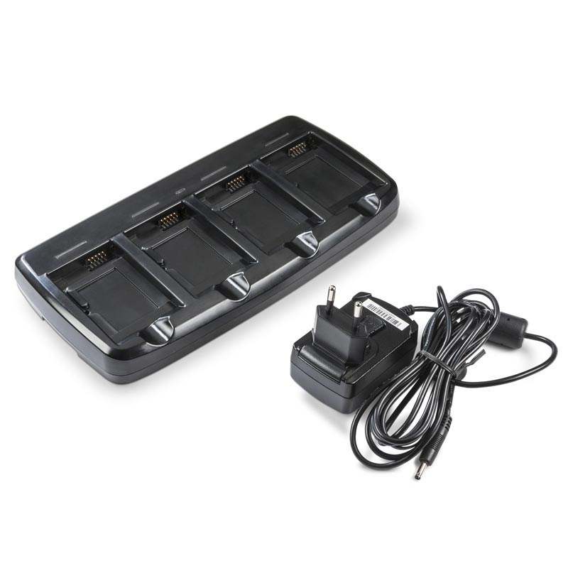 Common Quad Charger - EU Kit. Four-slot battery charging station is compatible with Dolphin 70e Black/Dolphin 75e (extended and standard), Dolphin 60s, and SL22h/SL42h Healthcare Captuvo sled extended batteries. Includes EU power cord and power supply.