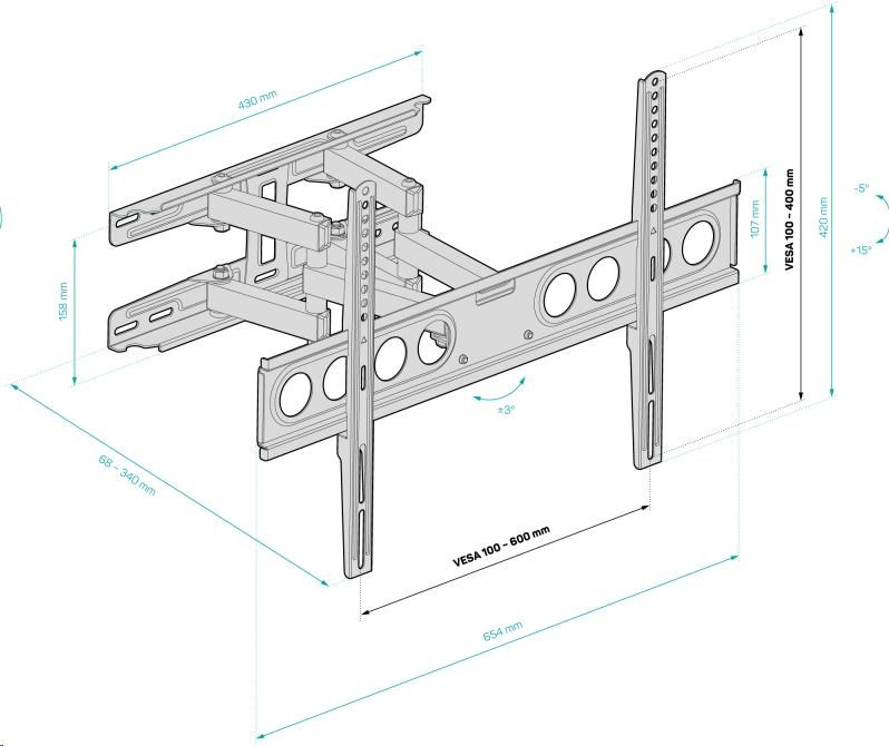 Nastavenie do požadovaného uhla si nevyžaduje uvoľnenie ani opätovné utiahnutie skrutiek (stačí uchopiť okraje televízora a nastaviť uhol)