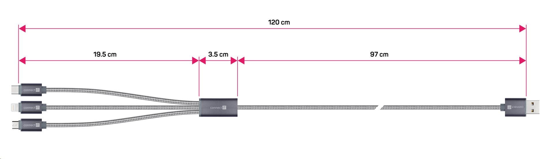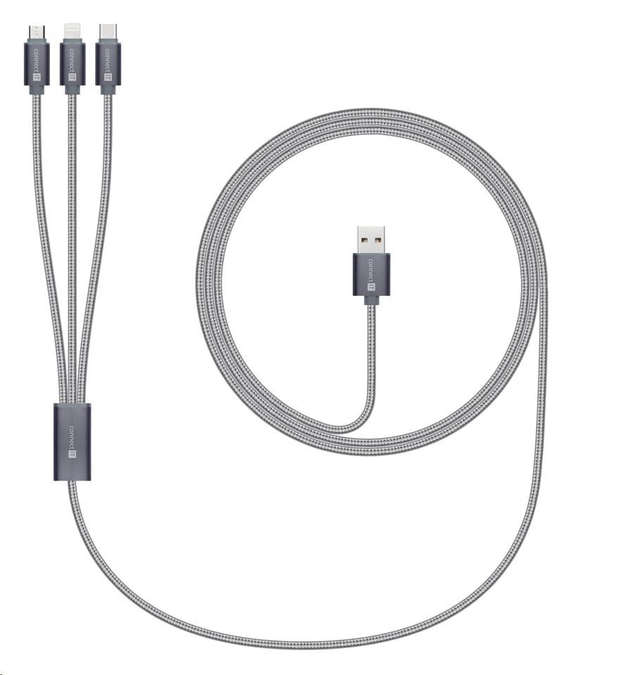 Univerzálny nabíjací kábel 3 v 1 na nabíjanie zariadení s konektormi Micro USB, Lightning a USB-C (typ C) umožňuje nabíjať až tri zariadenia súčasne s podporou rýchleho nabíjania pomocou max. prietok prúdu 2 A