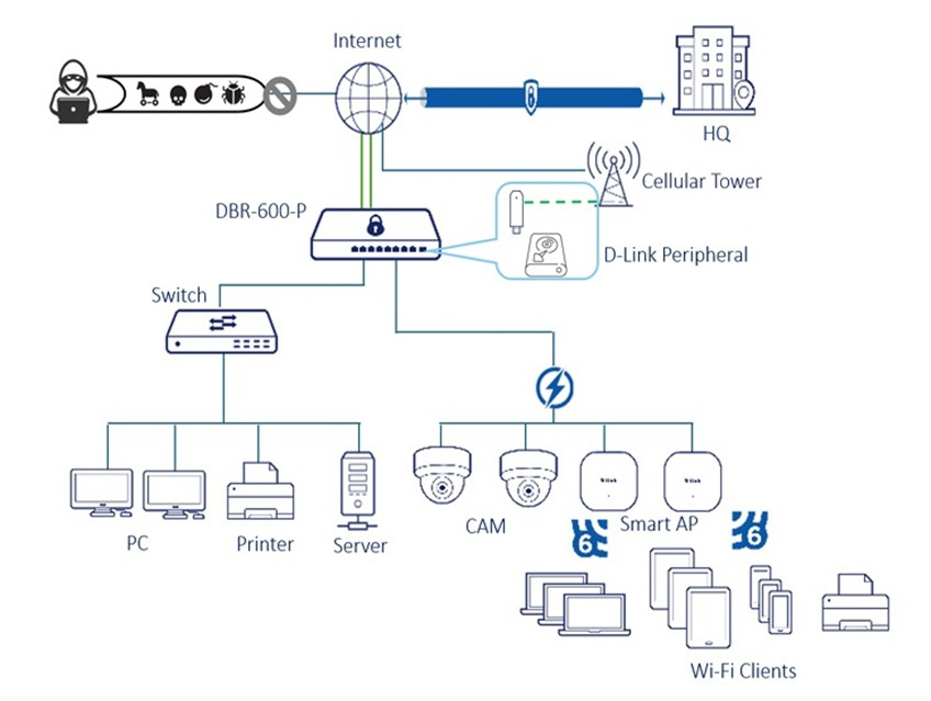 Je ideální pro malé kanceláře a kavárny, obsahuje USB port pro 4G/5G USB modem D-Link, který nabízí flexibilní zálohování internetu. Díky 2Gb/s firewallu a IPsec VPN tunelům zajišťuje bezpečný vzdálený přístup. Integrovaná správa AP a PoE zjednodušuje ovládání bezdrátových přístupových bodů, což z něj činí vynikající volbu pro firmy hledající efektivní a bezpečná síťová řešení.