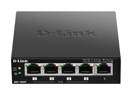 D-Link DES-1005P (revize B1) je 5-portový 10/100M PoE switch bez managementu, jehož první čtyři porty podporují PoE+ napájení 802.3af/802.3at, tj. max. 30W na port. Celkový PoE výkon přepínače je 60W. Ze switche tak lze napájet až 4 PoE zařízení, jako jsou IP telefony, Wi-Fi přístupové body nebo IP kamery. Switch je bez větráků, s externím napájecím adaptérem, v kovovém provedení pro položení na poličku.