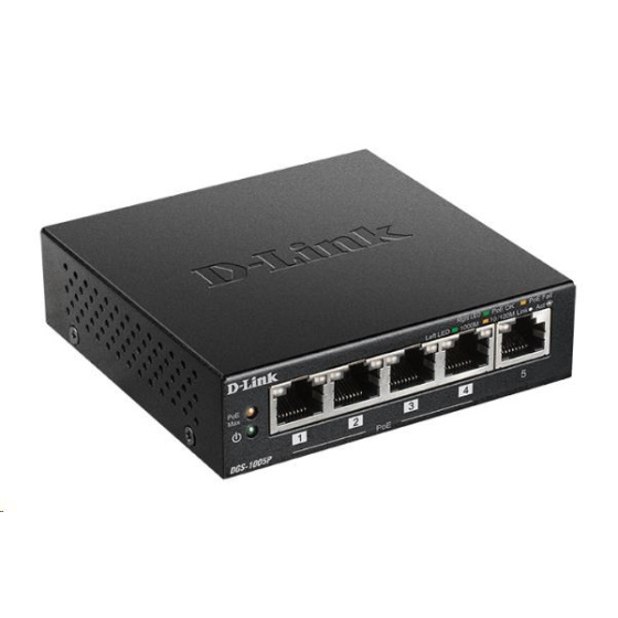 D-Link DGS-1005P 5-portový gigabitový stolový prepínač PoE+, 4 porty PoE+, rozpočet PoE 60 W