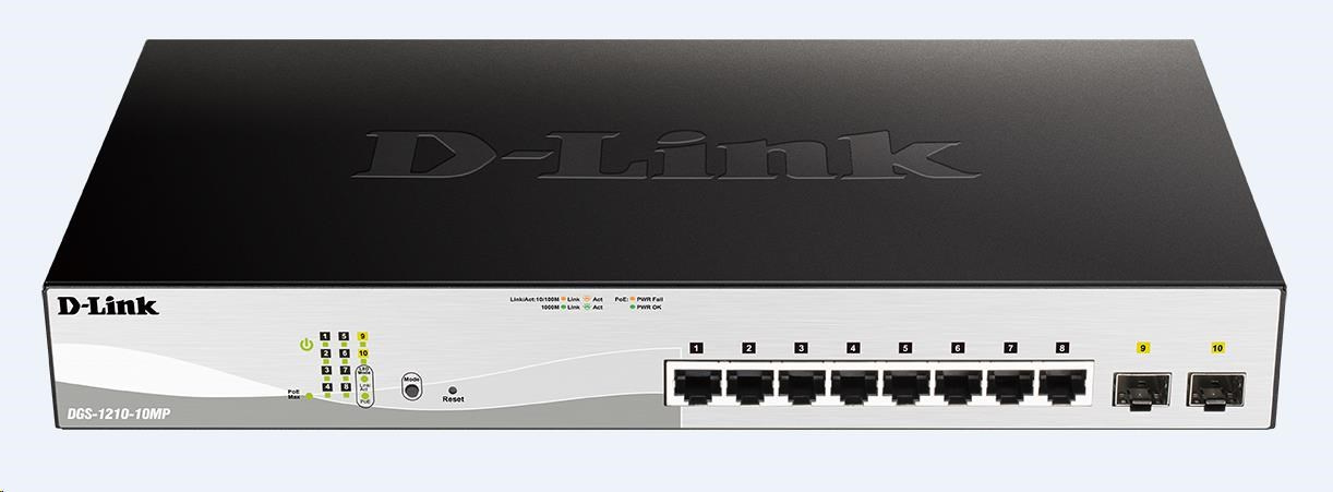 D-Link DGS-1210-10MP 10-portový gigabitový Smart+ PoE switch, 8x GbE PoE+, 2x SFP, PoE 130W, bez ventilátora