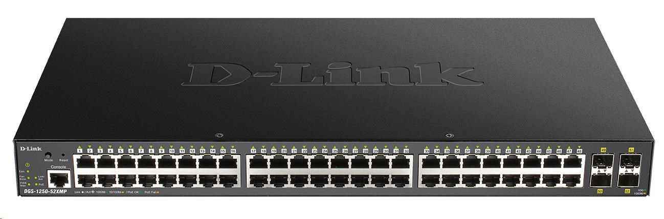 D-Link DGS-1250-52XMP 52-portový gigabitový inteligentný PoE switch, 48x GbE PoE+, 4x SFP+, PoE 370W