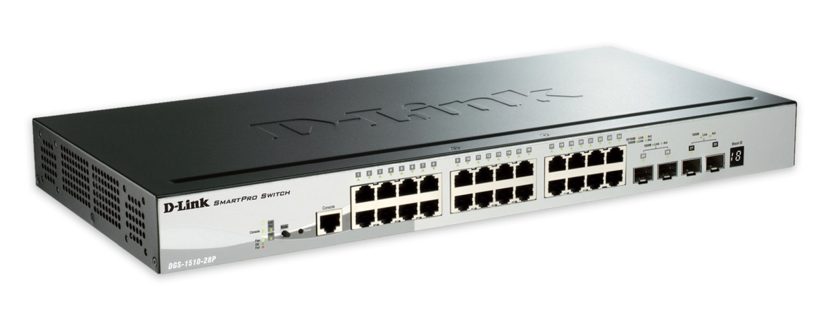 Popis D-Link DGS-1510-28P 28-Port Gigabit Stackable SmartPro PoE Switch 2x SFP, 2x 10G SFP+