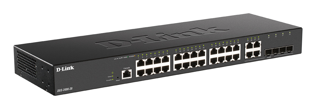 Popis D-Link DGS-2000-28 Managed switch, 24x GbE, 4x RJ45/SFP, fanless