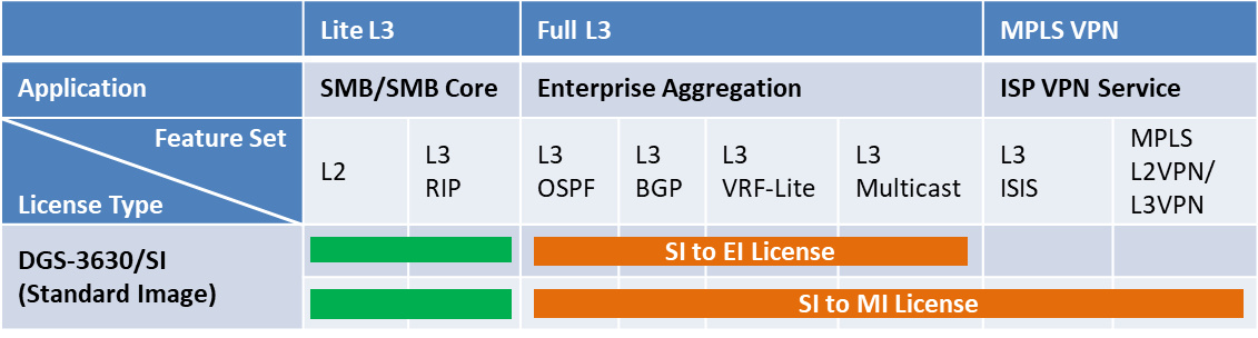 D-Link DGS-3630-28TC-SE-LIC je digitální licence pro 28-portový L3 stohovatelný Gigabit switch D-Link DGS-3630-28TC/SI. Licence slouží pro upgrade ze základní sady funkcí (Standard Image) na rozšířenou sadu funkcí (Enhanced Image). Licence přidává funkci Super VLAN a následující L3 funkce: