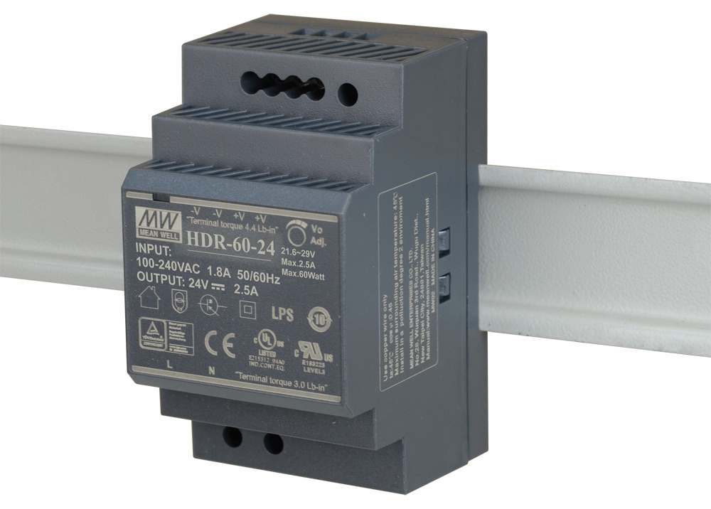 D-Link DIS-H60-24 je 60W 24VDC průmyslový pulzní napájecí zdroj s montáží na DIN lištu, s jističovým profilem.