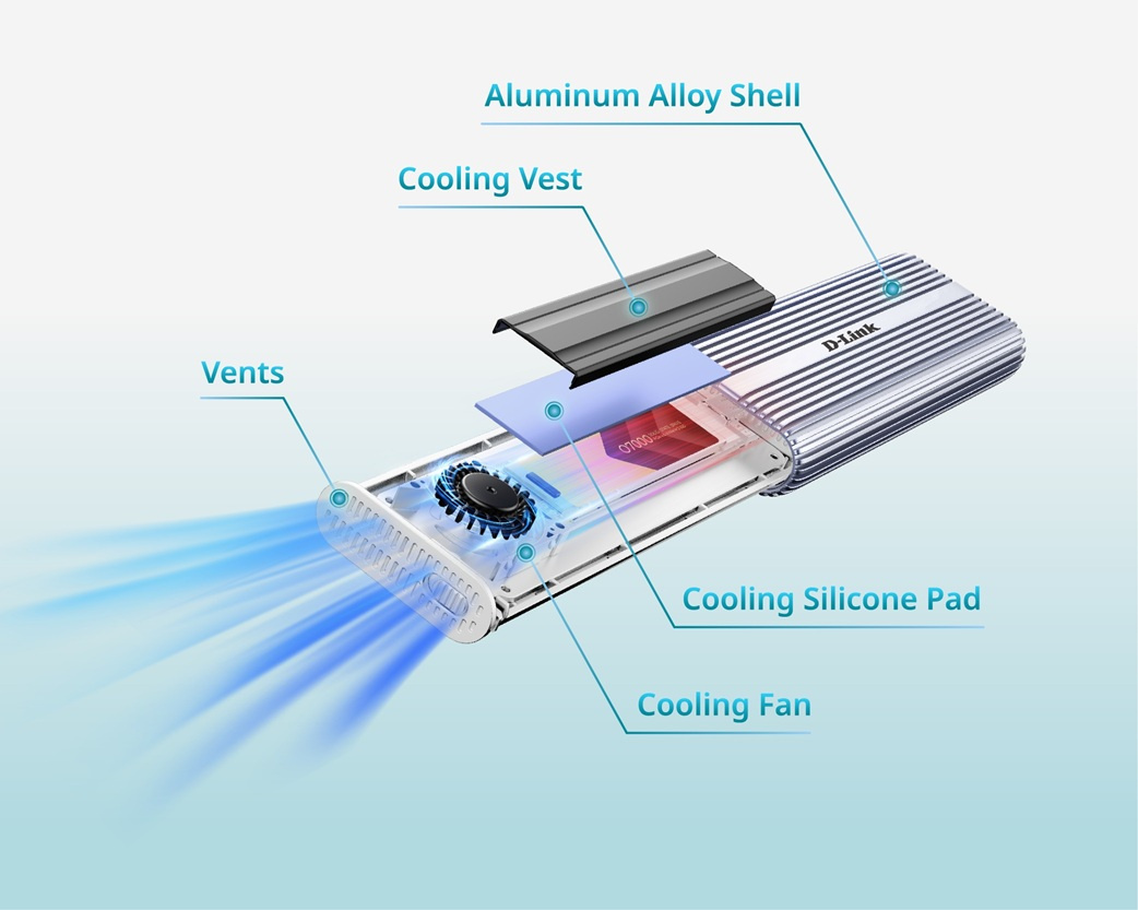 DSP-411 je vybaven chladicím pláštěm, tichým chladicím ventilátorem MagLev, silikonovou tepelnou podložkou a pouzdrem z hliníkové slitiny, které vytvářejí vysoce efektivní strukturu pro odvod tepla. Ventilátor MagLev zajišťuje vysokorychlostní proudění vzduchu s menším počtem pohyblivých částí, což zajišťuje trvalý výkon a stabilitu. Udržováním vašeho SSD disku v chladu i při vysokém zatížení bez rušivého hluku se můžete soustředit na bezproblémové vytváření, přenos a ukládání souborů, ať už vás práce zavede kamkoli.