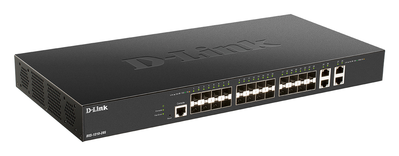 D-Link DXS-1210-28S je 28-portový 10G inteligentní L2/L3 řízený přepínač. Nabízí 24 portů 10G SFP+ a 4 metalické porty 10GBase-T RJ-45. Je vhodný jako páteřní prvek v malých a středních (SMB) sítích nebo pro agregaci v rozsáhlých podnikových (Enterprise) sítích. V serverovnách najde uplatnění jako Top of Rack (ToR) switch pro připojení serverů.