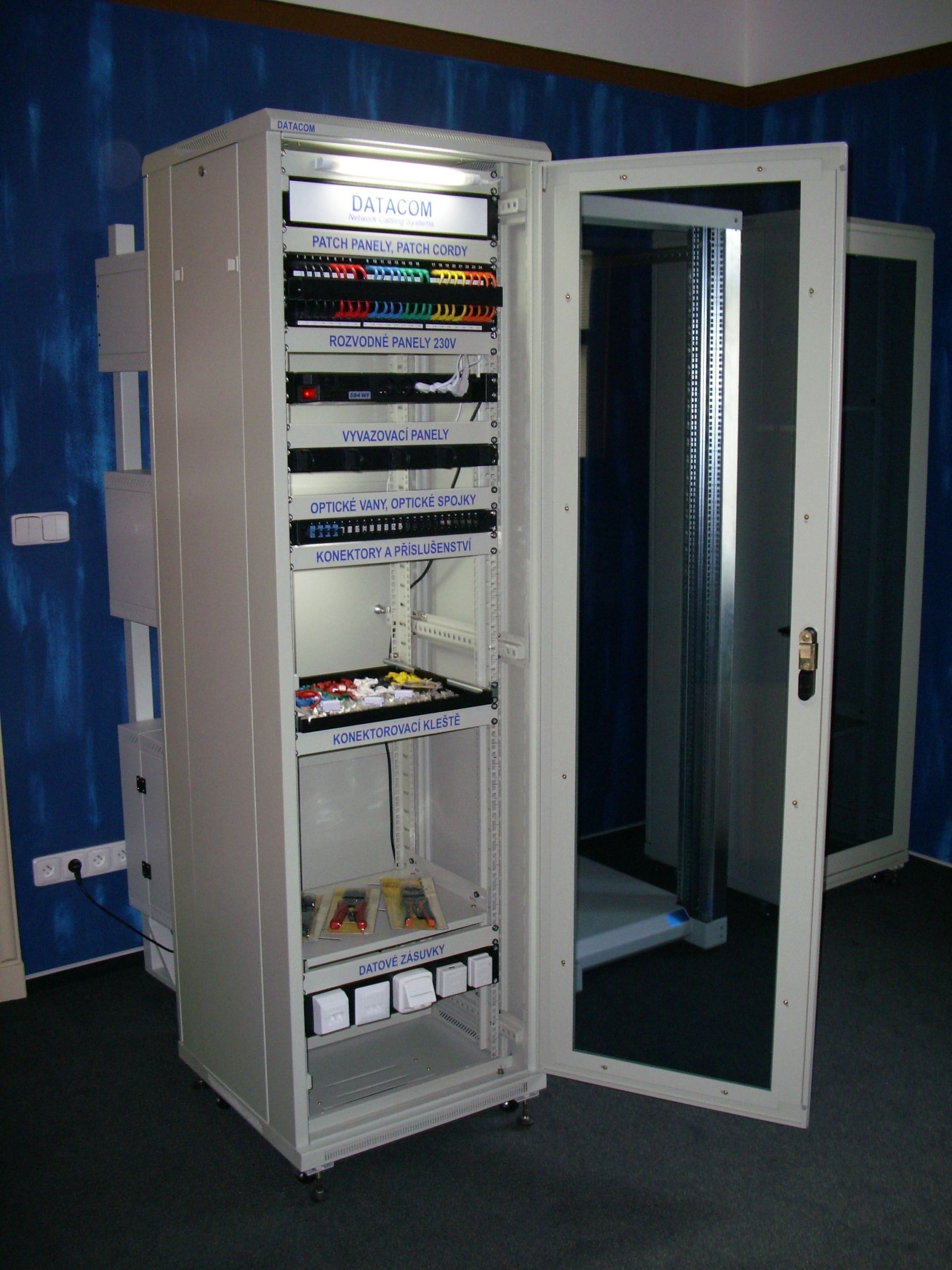 *20 setů montážní sada M6 *2 police (hloubka 550 mm) *4 ventilátorová jednotka (4x 15W, celkově 60W výkon) *4 kolečka *1 sada nožiček pod stojanové rozvaděče *2ks klíče přední zámek prosklených dveří (jeden zámek) *2ks klíče zadní zzámek plechových dveří (jeden zámek) *2ks klíče odnímatelné uzamykatelné bočnice (levá i pravá, tedy dve stejné zámky)