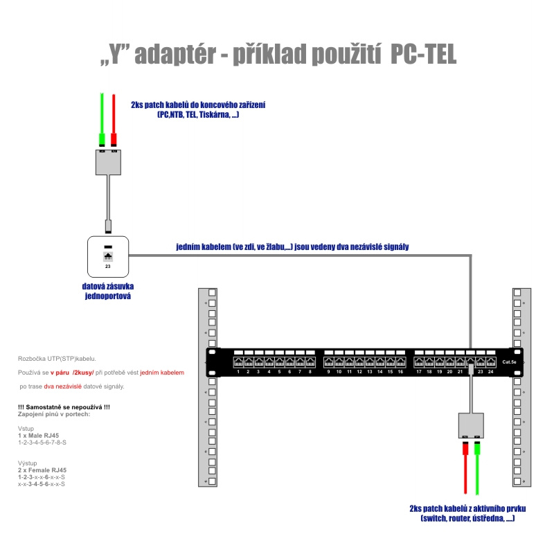 Stíněná rozbočka STP(také UTP) kabelu. Foto ilustrační (balení obsahuje 1ks) Používá se v páru při potřebě vést jedním kabelem datový signál + signál telefonní. Pro správnou funkčnost nutno zakoupit sudý počet Zapojení pinů: 1 x Male RJ45 1-2-3-4-5-6-7-8 2 x Female RJ45 1-2-3-x-x-6-x-xx-x-3-4-5-6-x-x