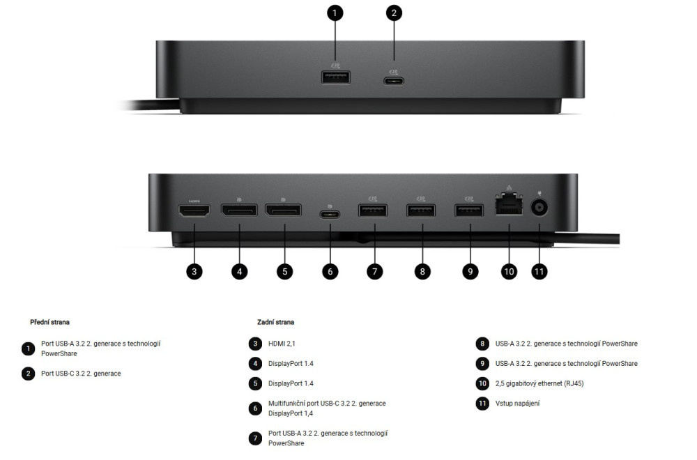* Porty USB (napájení) 4x USB-A 3.2 Gen 2 (4,5 W každý) 1x USB-C 3.2 Gen 2 (15 W) 1× multifunkční rozhraní USB-C DisplayPort (7,5 W) Všechny dodávají energii s počítačem nebo bez něj