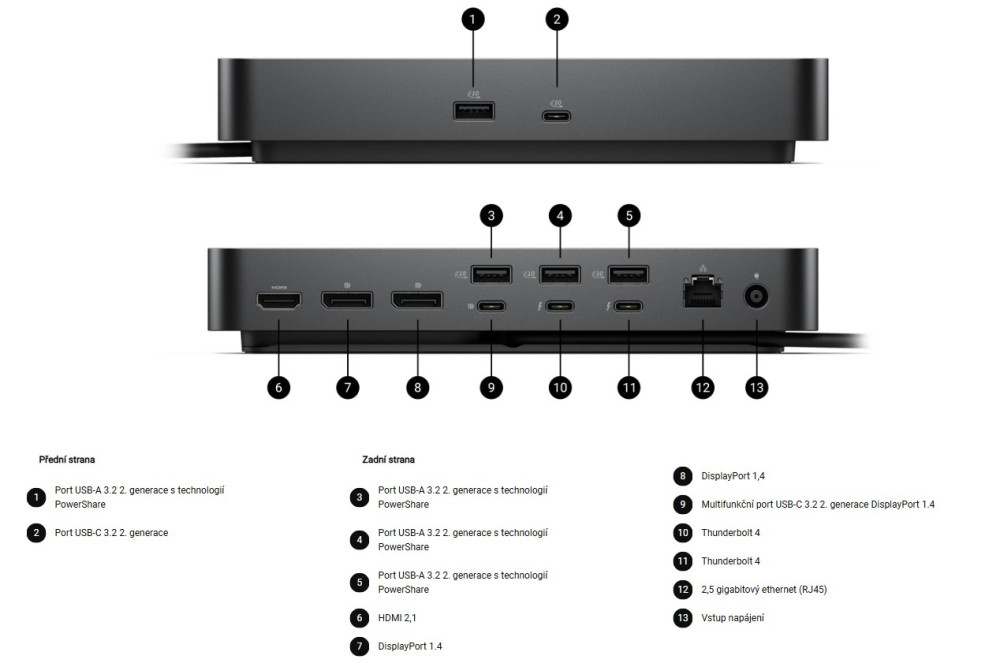 Porty USB (napájení) 4 x USB-A 3.2 Gen 2 (4,5 W každý) 1 x USB-C 3.2 Gen 2 (15 W) 1 × multifunkční rozhraní USB-C DisplayPort (7,5 W) 2 x Thunderbolt 4 (15 W každý) Všechny dodávají energii s počítačem nebo bez něj