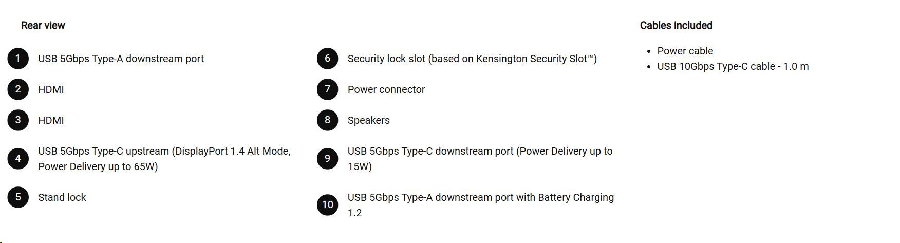 • 1 USB-C 5Gbps upstream port (DisplayPort 1.4 Alt Mode, Power Delivery až do 65 W)