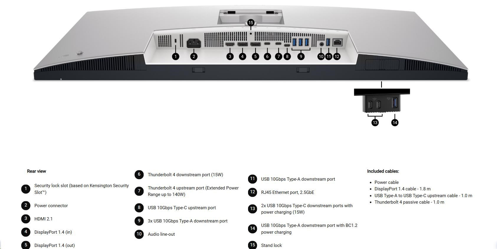 • 1 Thunderbolt 4 upstream port (DP1.4 (HDCP 2.2) s podporou DSC, PD: Až 140W EPR, prepínanie 2/4 Laní)