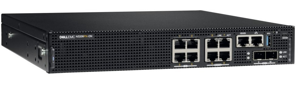Switch Dell EMC PowerSwitch N3208PX nabízí Poe 4x GbE RJ-45 porty, 4x 5G RJ-45 a 2x 10G SFP+
