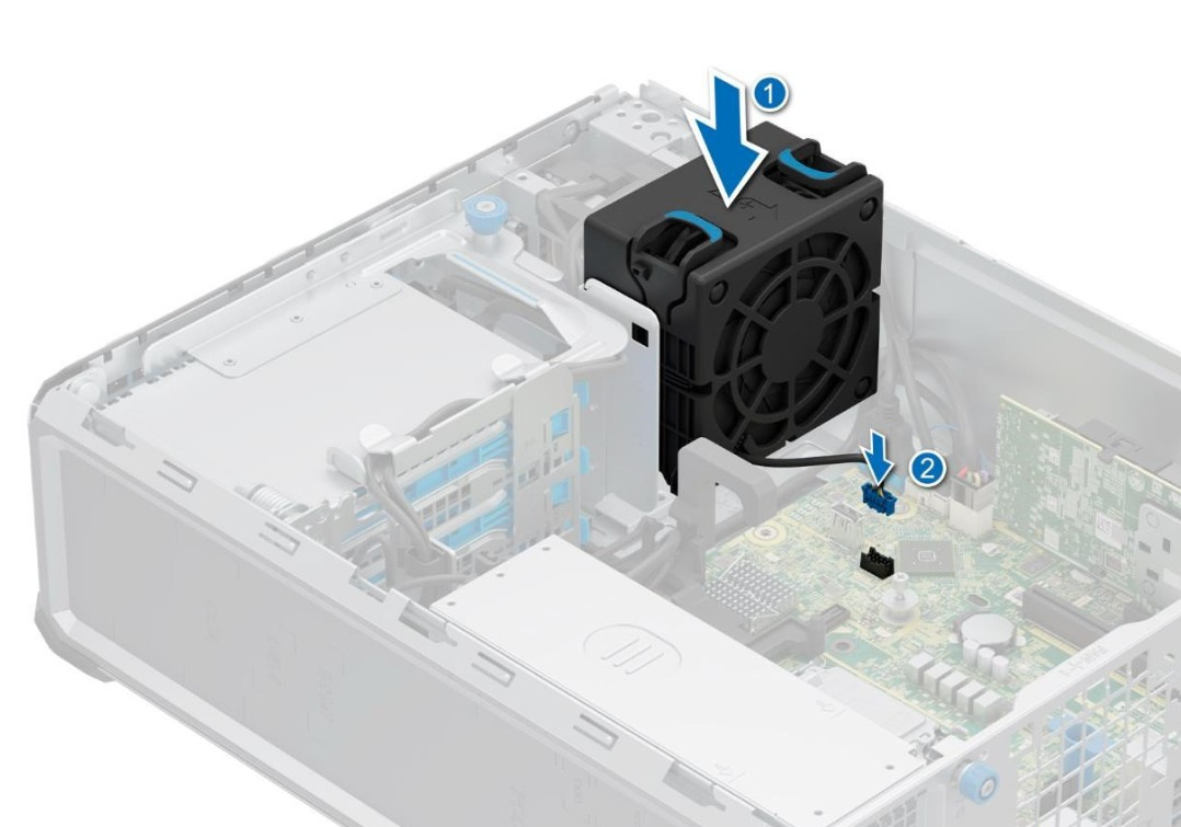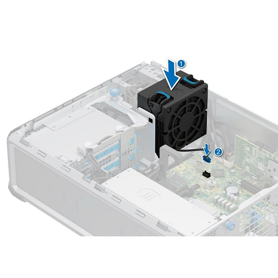Přídavný ventilátor určený pro server DELL PowerEdge T160, který je zapotřebí pro odvod většího množství teplého vzduchu při použití přídavných PCI karet, disků a především grafických karet.
