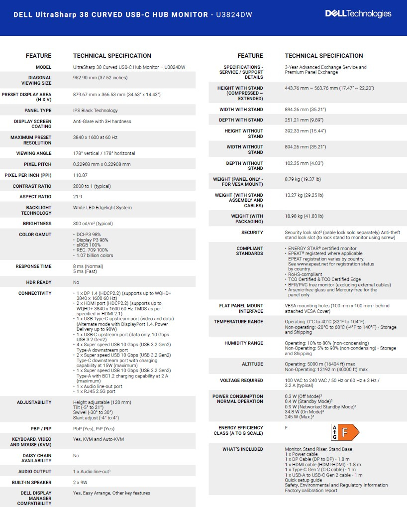 DIAGONAL VIEWING SIZE: 952.90 mm (37.52 inches) PRESET DISPLAY AREA (H X V): 879.67 mm x 366.53 mm (34.63” x 14.43”) PANEL TYPE: IPS Black Technology DISPLAY SCREEN COATING: Anti-Glare with 3H hardness MAXIMUM PRESET RESOLUTION: 3840 x 1600 at 60 Hz VIEWING ANGLE: 178° vertical / 178° horizontal PIXEL PITCH: 0.22908 mm x 0.22908 mm PIXEL PER INCH (PPI): 110.87 CONTRAST RATIO: 2000 to 1 (typical) ASPECT RATIO: 21:9 BACKLIGHT TECHNOLOGY: White LED Edgelight System BRIGHTNESS: 300 cd/m2 (typical) TCO Certified: Yes